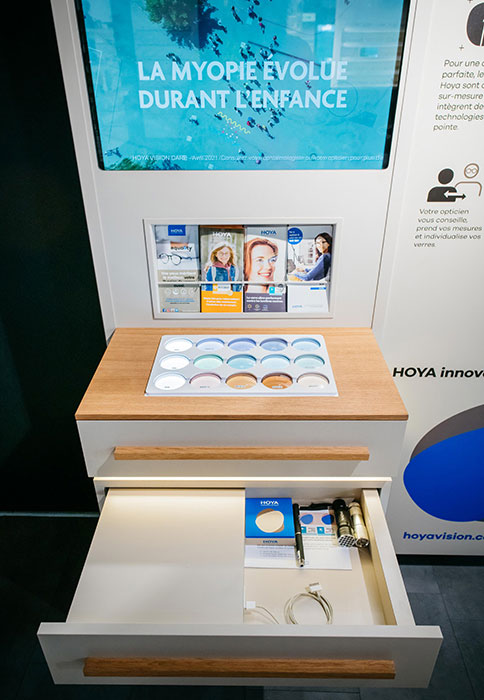 Cette innovation permet à l’opticien, en tant qu’expert de la vision, de définir les besoins visuels de leurs porteurs et de proposer la solution HOYA adaptée à leur style de vie. Cette nouveauté favorise la montée en gamme en impliquant le porteur dans le processus de choix de verre. Hoya Vision Experience associe technologie, valorisation du verre, et savoir-faire. Découvrez cet agencement d’espace de vente ultra-qualitatif et cette création de mobilier sur-mesure alliant technologie et design.